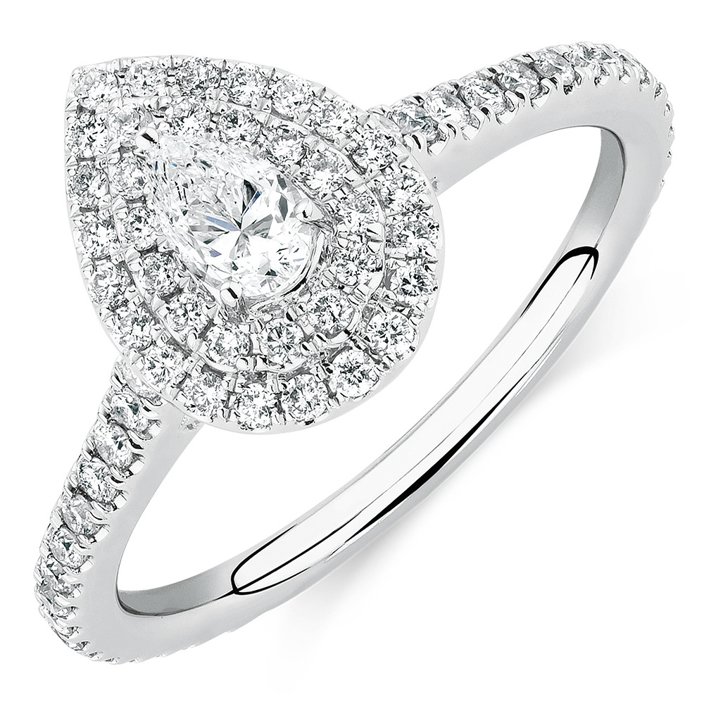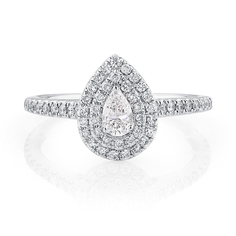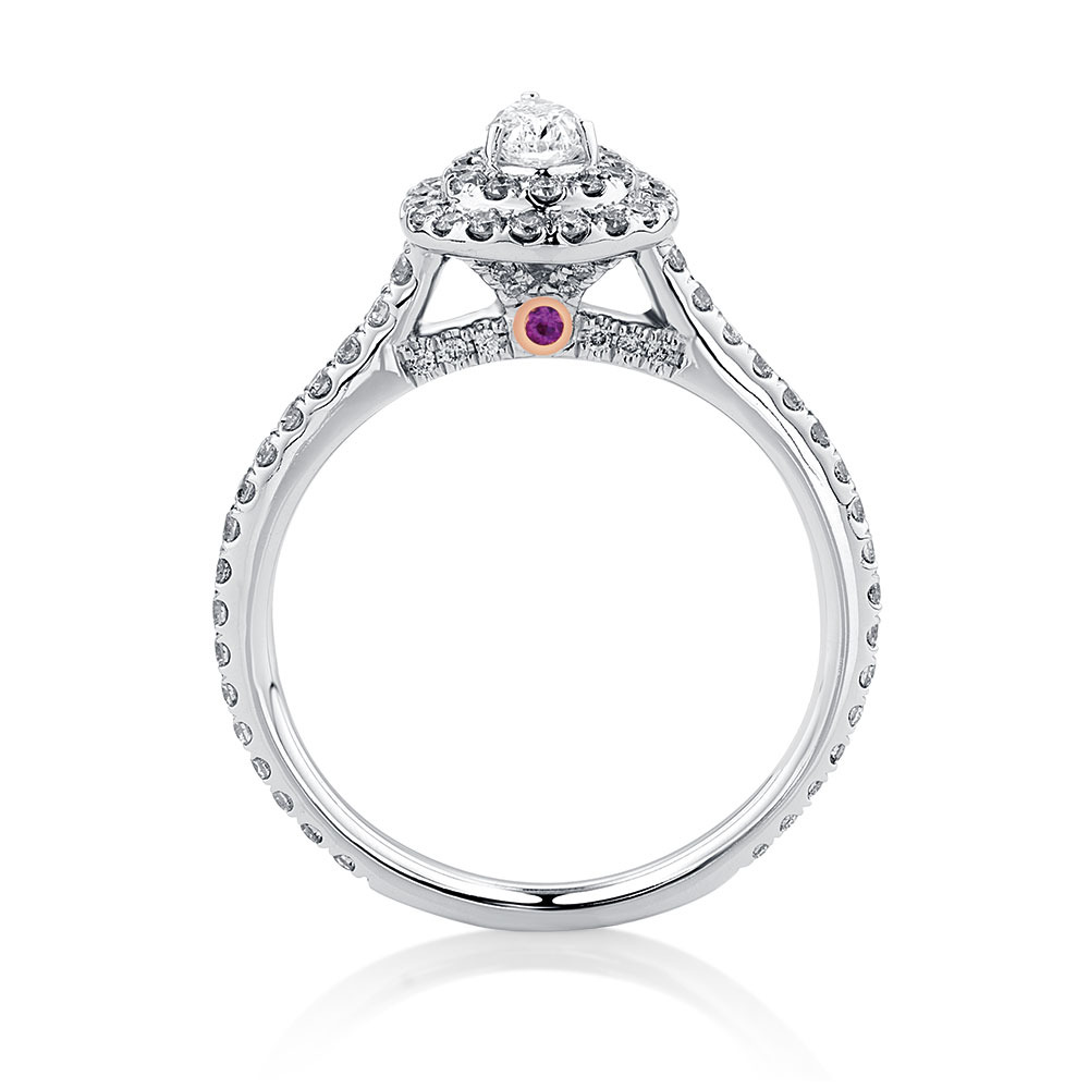 This glittering 0.87 carat total weight diamond GrandArpeggio ring is a stand-out choice. The 14ct white gold design features a pear cut centrepiece surrounded by a double halo. Finished with diamonds lining the fine band, and a signature pink sapphire set in 14ct rose gold, this ring will enchant her. Exclusive to the Michael Hill Designer Bridal Collection.